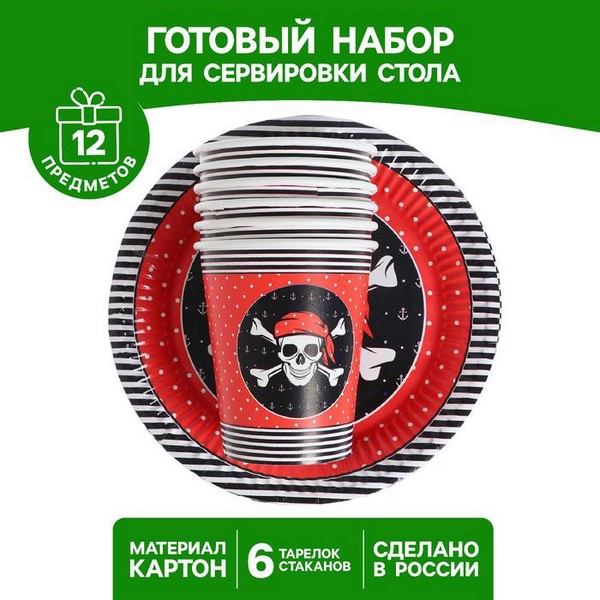 Набор бумажной посуды "Пиратская", 6 стаканов, 6 тарелок 6923716 6923716