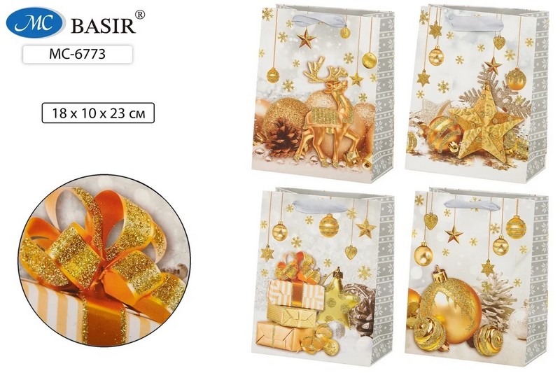 Пакет подарочный "НОВОГОДНИЙ ШИК" плотный, цветной с рисунком,с блестками -золото, размер 18*10*23см. МС-6773