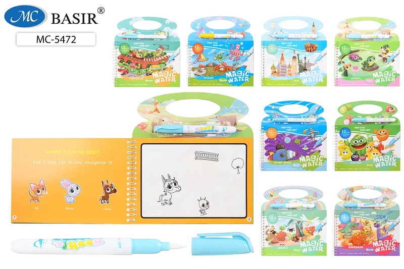 Водная раскраска: книжка-раскраска на евроспирали, 4 рисунка + маркер (заполняется водой), рисунки можно создавать вновь и вновь, размер 20*21,5 см, 8 видов обложки. МС-5472