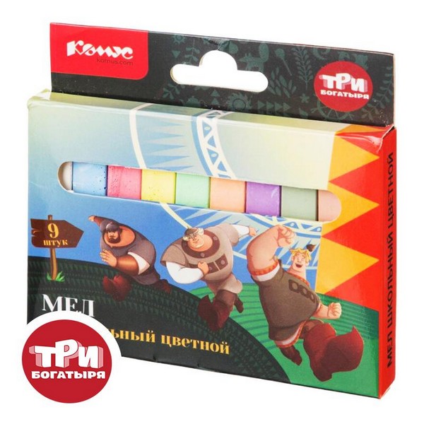Мелки школьные цветные 9 цв., КОМУС Три богатыря квадратная форма в картонной коробке 1845531