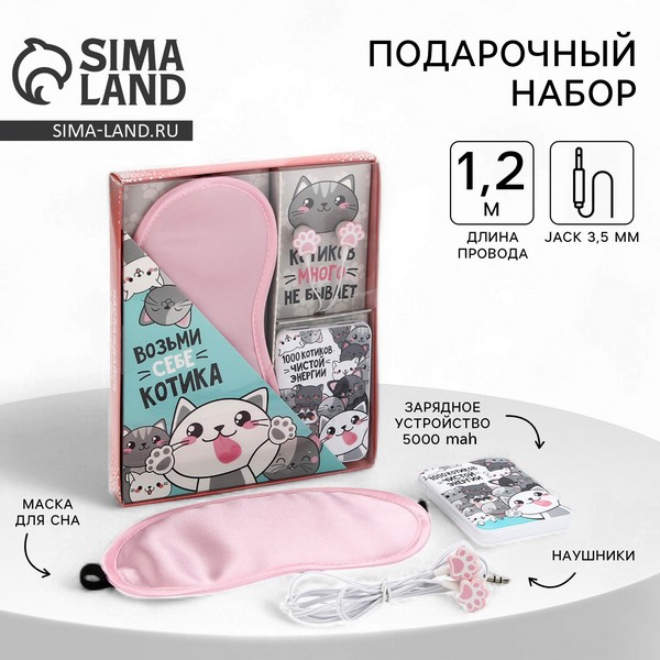 Наушники, маска для сна и заряд. устр-во 5000 mAh м. PB-06 "Котики",20,5 х 16,5 см 5376767 5376767