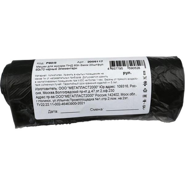 Пакеты для мусора ПНД 60л 8мкм 20шт/рул 60х70 черные Элементари 2005117