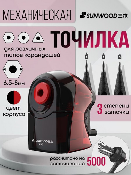 Точилка механическая 1 отверстие 6-8мм, корпус прозрачный красный/черный SUNWOOD X30T-RED